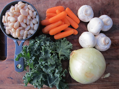 In a heavy bottomed soup pan, saute the garlic, onions and carrots in EVOO until tender. Add the chicken stock and water and bring to a boil. Reduce heat. Add the mushrooms, navy beans, turkey sausage, parmesan rind, cayenne pepper and kale. Let simmer for 20-30 minutes over medium low heat. Enjoy!